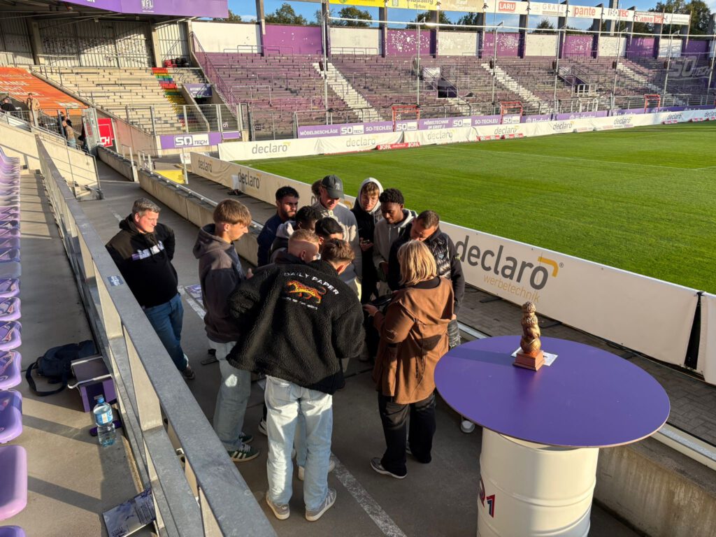 Nach einer Stadtführung, die die Mannschaft unter anderem auch zum Löwenpudel-Denkmal führte – jenem Denkmal, das unserem Preis seinen Namen gibt – ging es zurück ins Stadion. Dort warteten verschiedene Stationen, organisiert von der Brigade Nord, der Fanabteilung des VfL und uns vom Löwenpudel e.V..